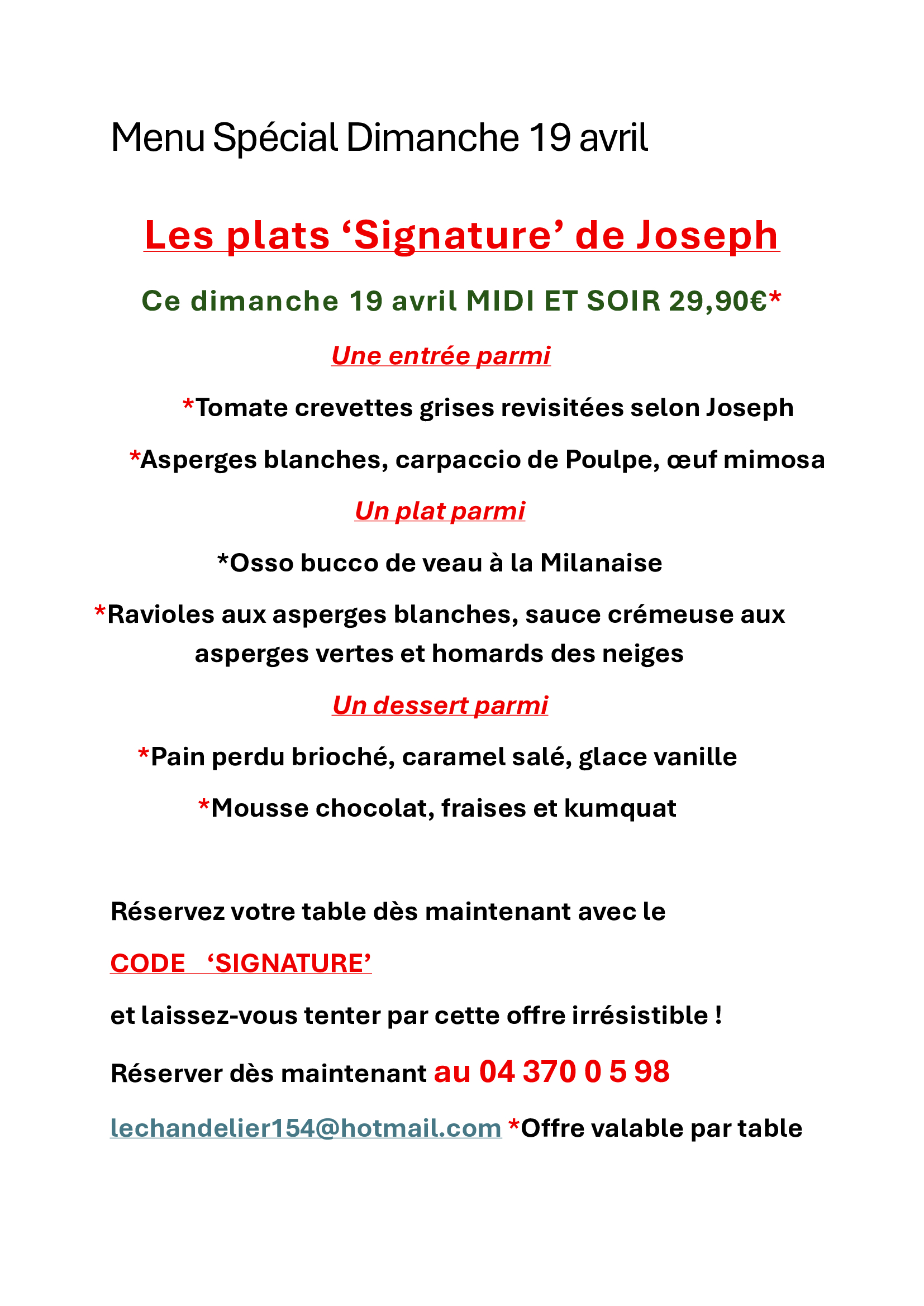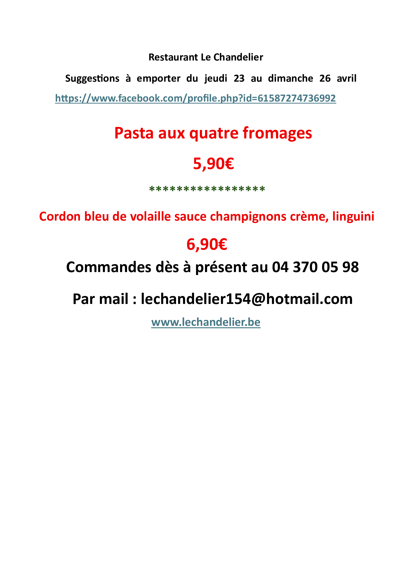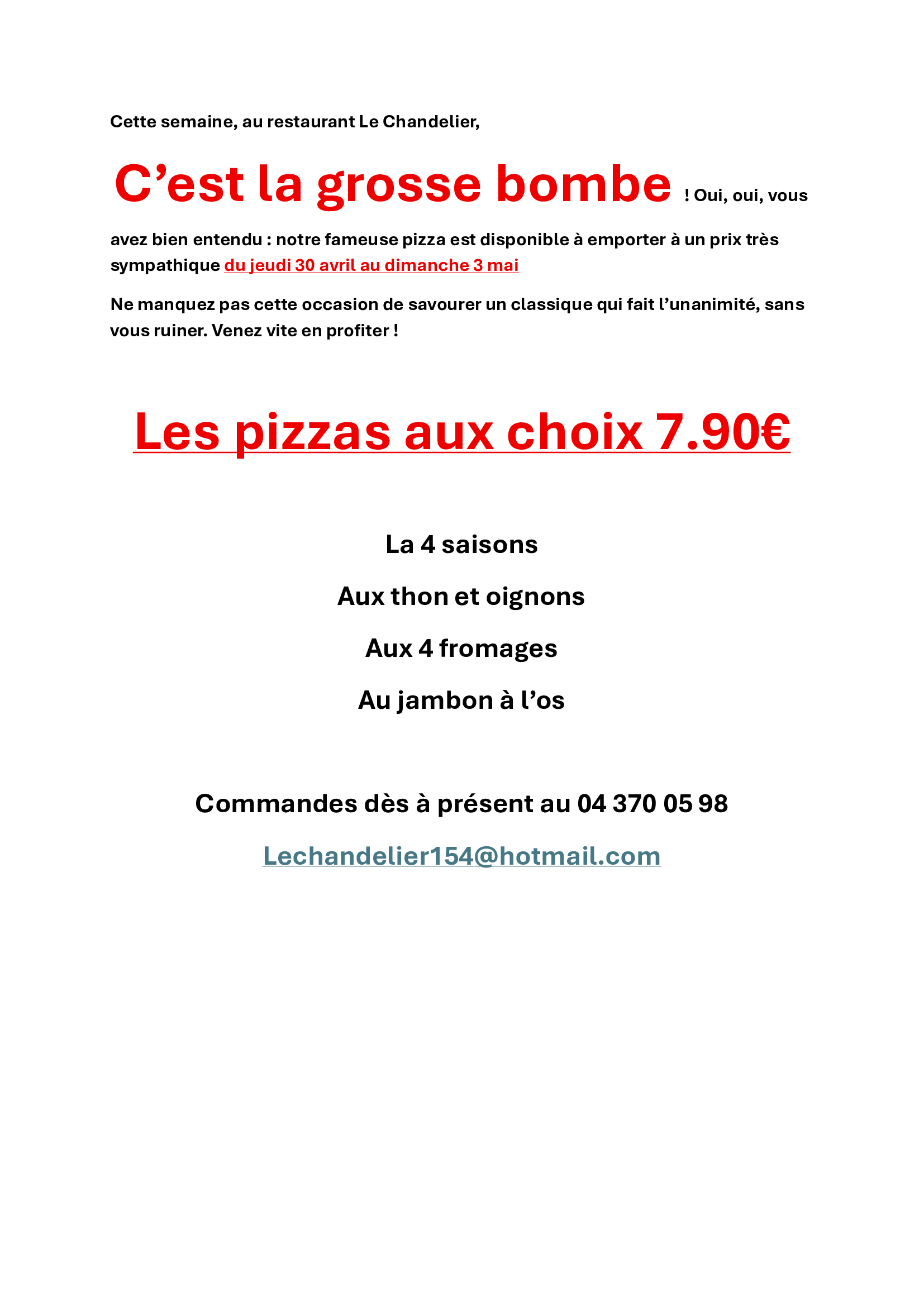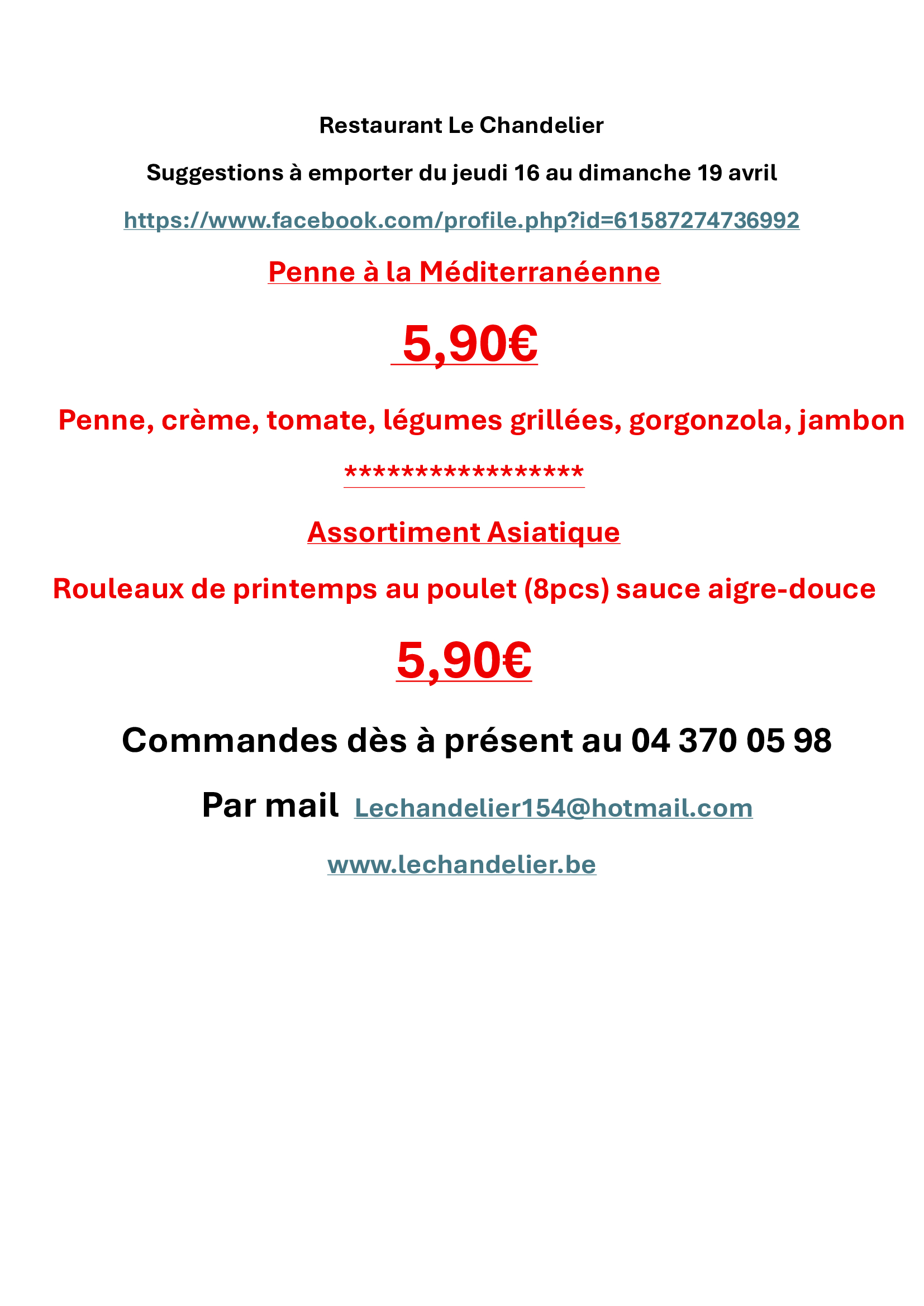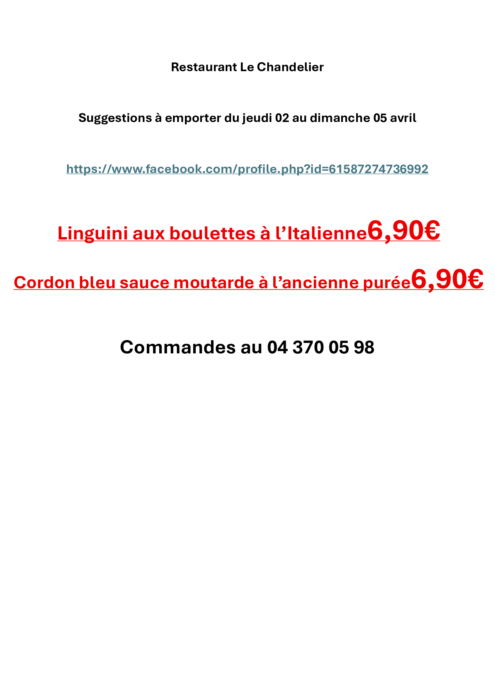 Le Chandelier est disponible par téléphone tout les jours pour vos commandes et réservation.