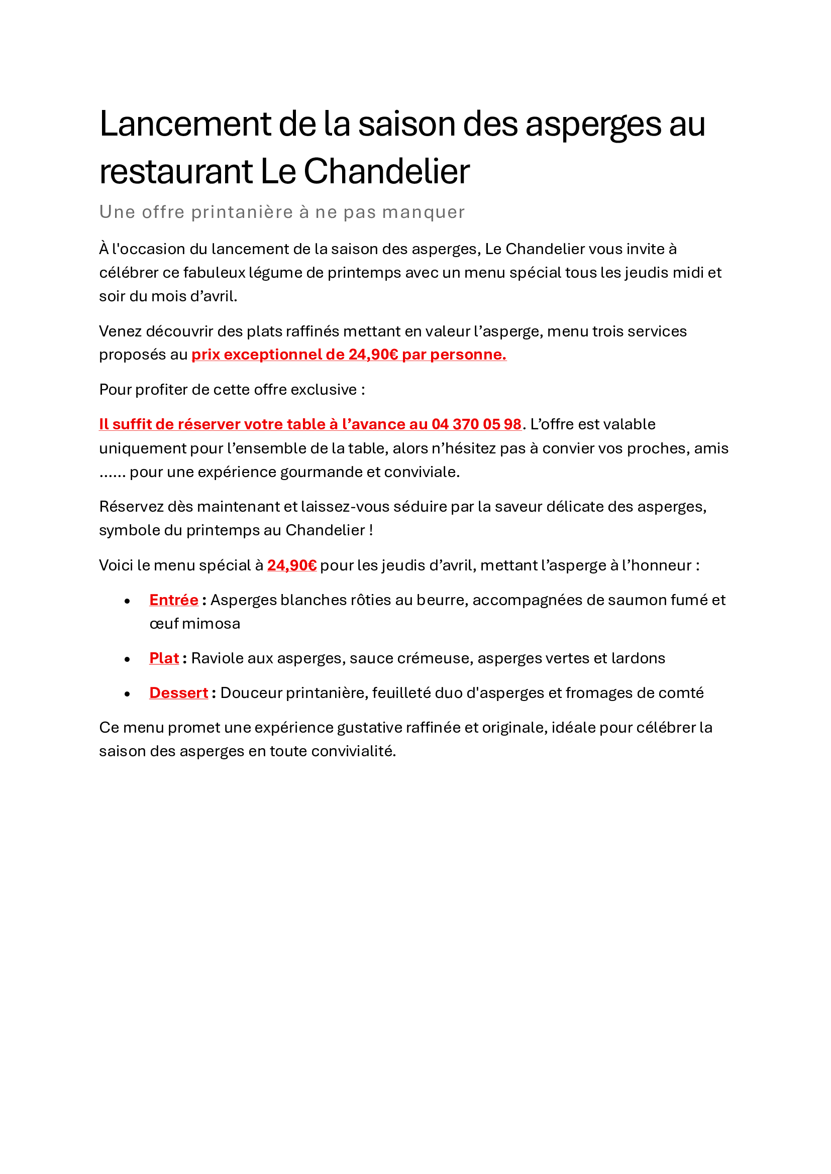 | Un très grand merci, à toutes l’équipe du chandelier pour la soirée de notre repas de fin d’année, 41 convives satisfait, et ravis. Très bien mangé, services impeccable et très bon choix des vins. |